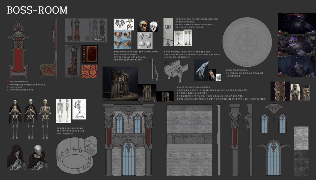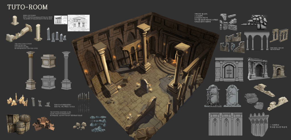 3D 핵앤슬래시 장르의 게임 ‘AZOR’를 제작하며, 음울하고 어두운 중세 분위기에 어울리는 배경을 기획하고 구현했습니다. 여기에 약간의 판타지 요소를 더해, 플레이어의 호기심을 자극하는 독창적인 디자인으로 완성했습니다. 단순히 2D의 평면적인 이미지에 머무르지 않고, 직접 3D로 모델링하고 작업하면서 구상했던 아이디어들이 하나씩 실현되는 과정을 손수 구현하였습니다. 또한 어둡고 암울한 세계관에 어울리는 조명과 소품을 세밀하게 배치하여, 플레이어가 마치 그 세계 속에 직접 들어온 듯한 몰입감을 느낄 수 있도록 연출했습니다.