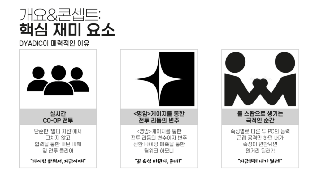 게임 <DYADIC: Pilgrimage of the Fallen>의 기획을 담당했습니다. 스토리 콘텐츠와 게임성을 유기적으로 연결하는 것에 집중했으며, 내러티브를 시스템이 받쳐 주어 보다 입체적인 경험을 선사하기 위해 노력했습니다.